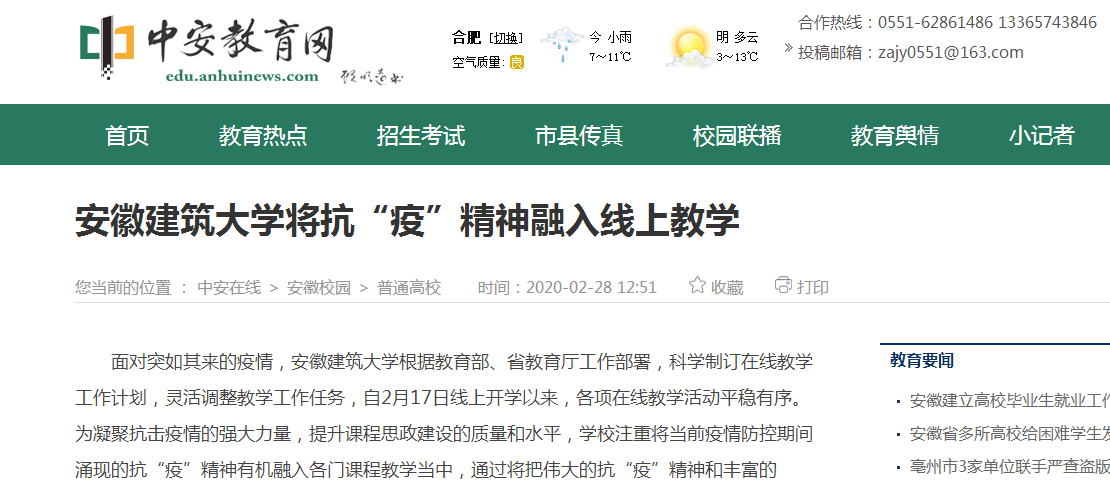 编者按:为凝聚抗击疫情的强大力量,提升课程思政建设的质量和水平,学校注重将当前疫情防控期间涌现的抗“疫”精神有机融入各门课程教学当中,真正助推课程思政教育教学活起来、实起来、动起来。228日,中安在线对此进行了报道。