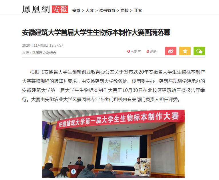 本次大赛经校内外专家评审、标本制作视频复审,最终作品《贰零贰零“亿”心一疫》获一等奖;《江南知秋》、《俏荷汤》、《一朝天堑变通途》分获二等奖;《生命共同体》、《一品徽州》等五组作品分获三等奖;《重生》等八组作品分获优秀奖。其中一、二等奖获得晋级2020年安徽省大学生生物标本制作大赛比赛资格。