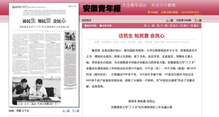 安徽城乡民生调查团队途行千里,感知百姓生活点滴、撰写百篇调查文章。这些调查感受、专题报告和研究报告获得多项国务院发展研究中心颁发的表彰以及安徽省“三下乡”各类荣誉。