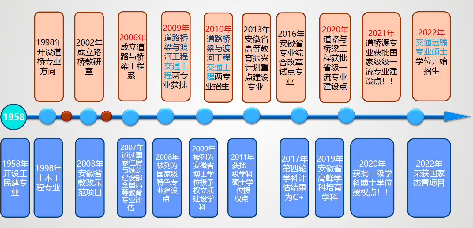 道路桥梁与渡河工程专业始由1998年土木工程专业道桥方向发展而来,2010年获教育部批准作为独立专业进行招生和培养。2013年列为安徽省专业改造与新专业建设试点专业,2020年获批安徽省一流本科专业建设点,2021年获批国家级一流本科专业建设点,目前设置道路和桥梁两个专业方向,专业所在土木工程一级学科具有博士学位授予权,专业相关领域还具有交通运输专业硕士学位授予权。