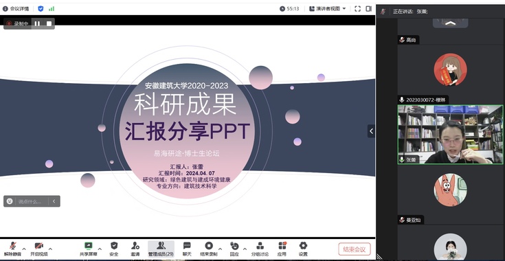 他们向参加分享会的研究生们深入分享了考博的心路历程与学术心得。张蕾同学以时间为线索,细细梳理了她在绿色建筑与建成环境健康领域研究生涯中的科研成果与竞赛风采,为大家展现了她的学术经历;唐庆伟同学则深耕于控制科学与工程领域,他详尽地分享了科研道路上的感悟与博士阶段的规划,特别针对其硕士毕业论文《单模态和跨模态行人重实别的算法研究》进行了深刻剖析;穆琳同学则从申博的筹备、导师的选择、成果的展示到材料的提交等关键环节,为大家提供了宝贵的经验之谈;高尚同学以高分子材料为研究核心,介绍了PLA/PBAT共混物复合体系的研究进展与产业化推广,并展示了他的专利发明,与同学们一同探讨了科学原理与应用之间的紧密联系。
