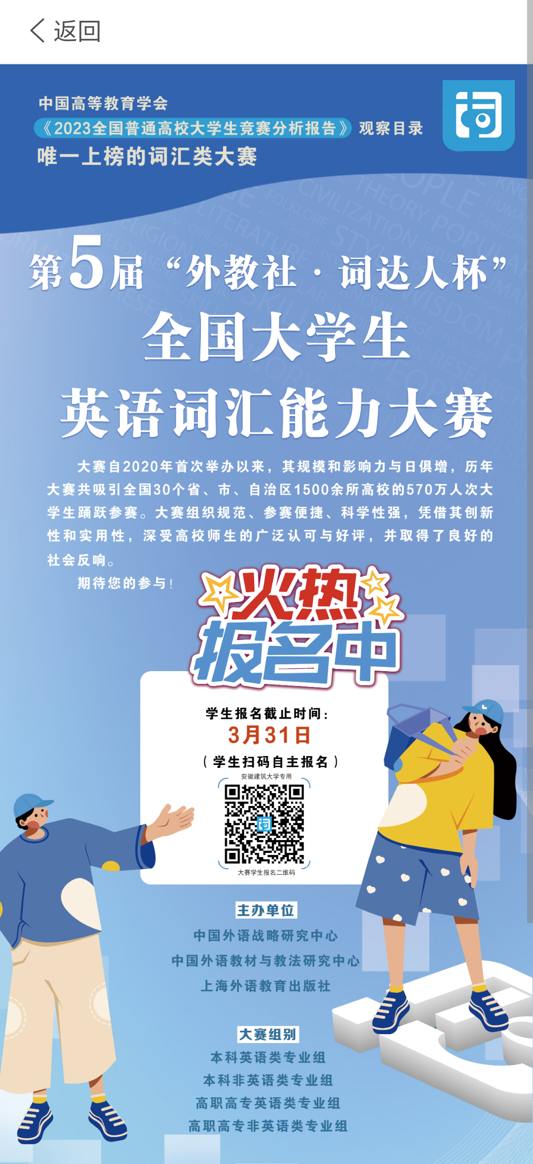 报名时间为即日起至2025331日。参赛选手务必先关注微信公众号词达人,进入学生端,使用右上角的扫一扫功能,扫描底部的本校专属报名二维码。进入报名界面后,参赛选手须如实填写本人姓名、学号、组别等信息,确认提交完成报名。请注意:填报信息与竞赛成绩、获奖证书挂钩,如果填报错误或经核查不实,将可能被取消竞赛成绩。