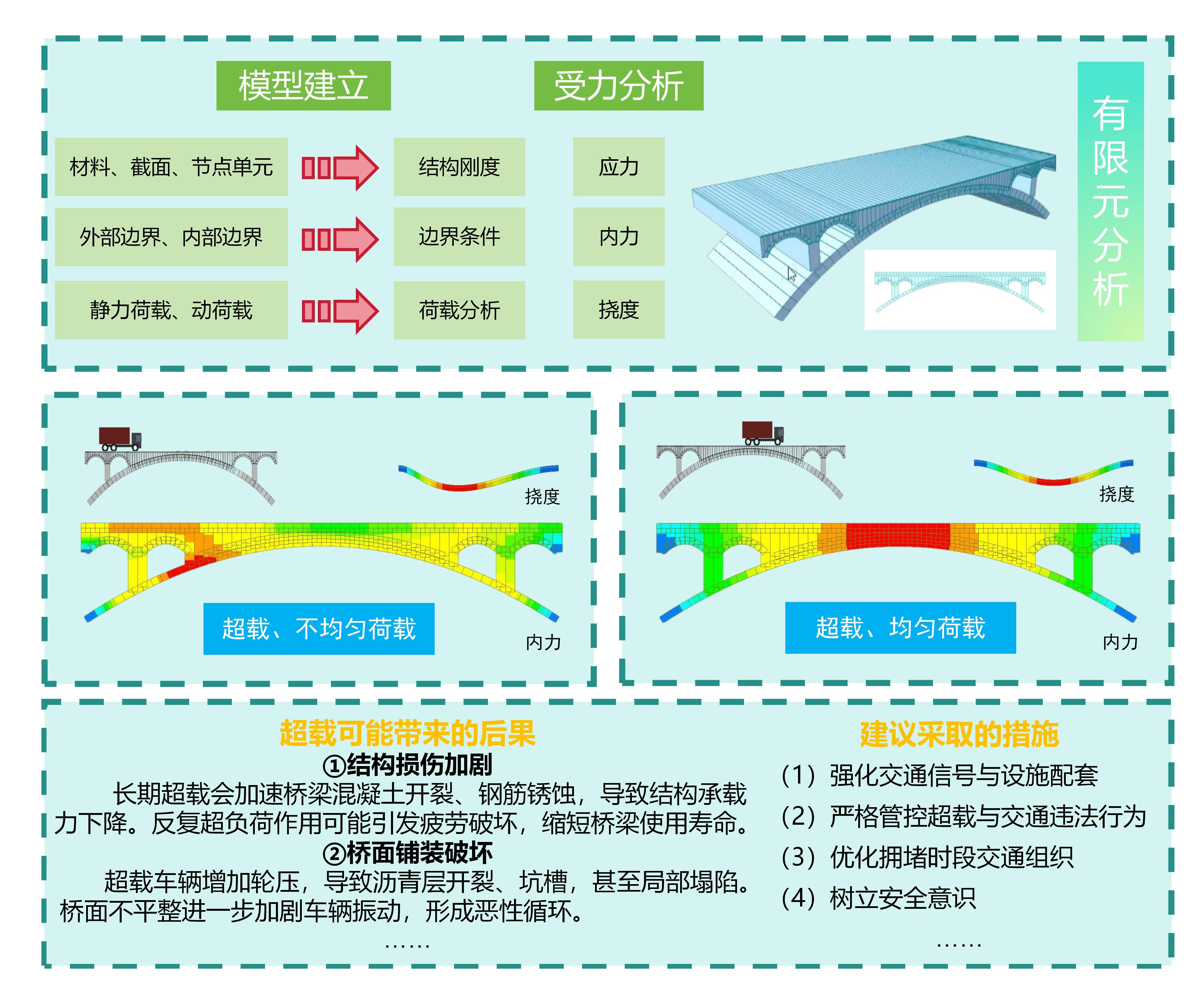 四天时间里,团队按计划穿梭于潜山城区的桥梁之间,脚步遍布21座桥梁:前两天的桃园桥、东关巷便民桥和梅河桥等11座桥梁覆盖了便民通道、主干道桥梁等多种类型;第三天,新西河大桥、车轴寺大桥和利民大桥等6座桥梁的调研,将范围延伸至城市外环线,填补了区域空白。同时进行了相关有限元软件的分析,力求将理论知识运用到实践当中。