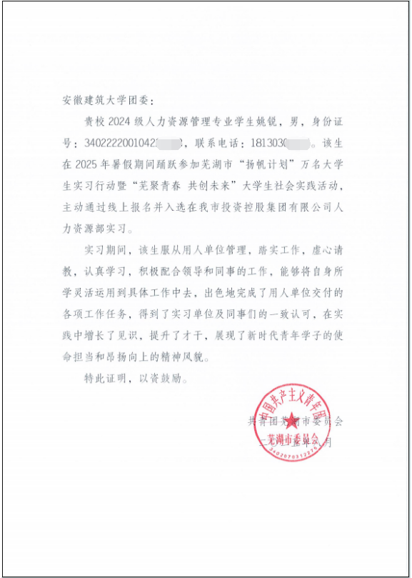 本网讯  近日,学校收到共青团芜湖市委员会发来的表扬信,对公管学院2024级人力资源管理专业学生姚锐,在“扬帆计划”实习实践活动中的出色表现给予高度认可与赞扬。