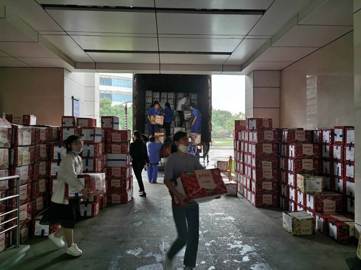 本网讯 6月22日,三辆满载新疆和田地区皮山县农特产品的货挂车在雨中抵达我校南北校区。在校后勤集团、保卫处等相关部门和各基层分会的协同和配合下,克服暴雨、闷热等恶劣天气带来的诸多困难,经过紧张有序的下货、清点、分发等环节,我校顺利完成助销该地农特产品工作。