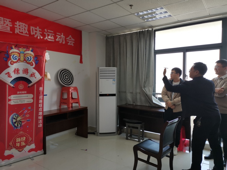 趣味游艺活动形式多样,以自由组队和系、教研室代表组队的形式进行。老师们热情高涨,踊跃参加,活动现场热闹非凡,洋溢着喜庆祥和的节日氛围。“投飞镖”等技能型游戏考验老师们的思辨力和专注力,“多人报团”、“抢板凳”等趣味性游戏考验老师们的应变力和协作力。欢笑声、呐喊声、助威声,一次次将活动推向高潮。