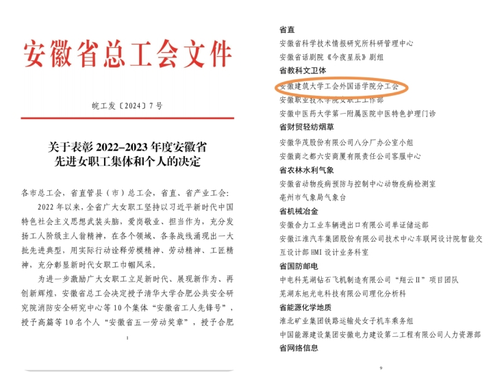 本网讯 近日,安徽省总工会公布了2022-2023年度安徽省先进女职工集体和个人表彰决定,我校外国语学院分工会荣获“安徽省五一巾帼标兵岗”称号。