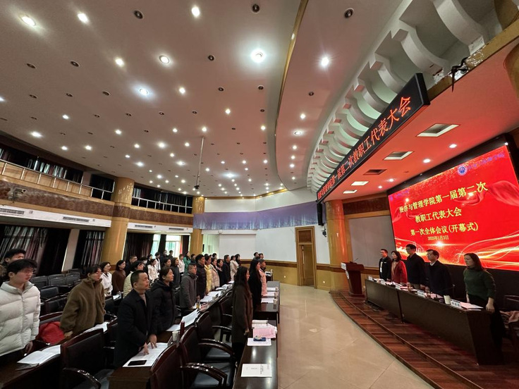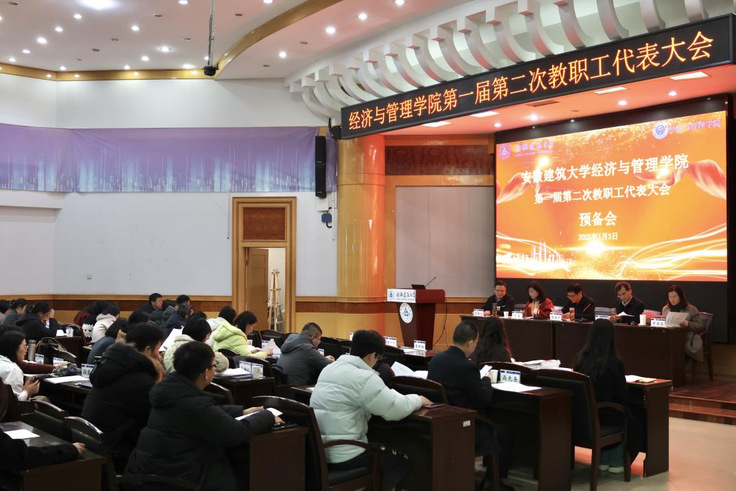 本网讯 为切实保障全体教职工在学院事务中的知情权、参与权与监督权,大力推动学院教职工代表大会制度规范化、民主化与科学化,持续激发教职工在教育事业中的奋进力量与创新活力。2025年1月3日,经济与管理学院第一届第二次教职工代表大会在金寨路校区建树楼三楼报告厅隆重举行。40名经管学院一届二次教代会代表、12名列席代表参加大会,会议由学院党委书记陈国中主持。