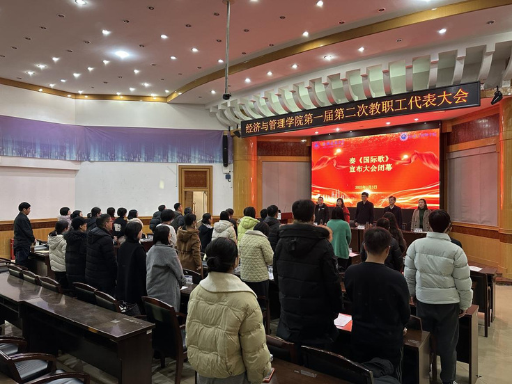 大会第二次全体会议上,与会代表表决通过了《关于学院工作报告的决议(草案)》《关于工会工作报告的决议(草案)》《经济与管理学院2024年绩效工资分配实施细则(草案)》,大会在雄壮的《国际歌》中落下帷幕。