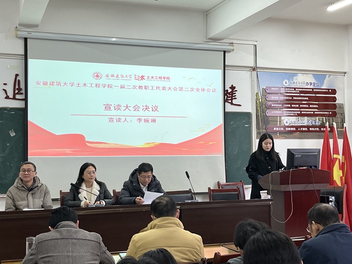 本网讯 1月9日下午,土木工程学院一届二次教职工代表大会在徽匠楼 2306 会议室隆重召开,学院领导、全体正式代表以及列席代表齐聚一堂。会议由学院党委书记王媛主持。