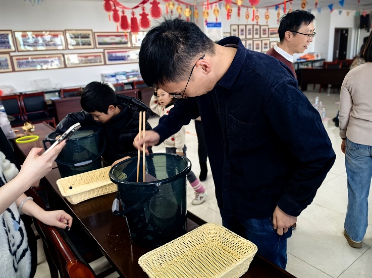 夹玻璃球项目考验了教职工们的冷静、耐心和手部协调性。选手们手持筷子,全神贯注地将玻璃球从一个容器夹到另一个容器中。只见筷子在玻璃球间穿梭,有的选手动作娴熟,迅速完成任务;有的选手则略显紧张,但依然坚持不懈。围观的同事们也纷纷为他们加油助威,现场欢声笑语不断。
