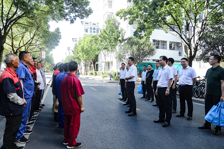 校领导一行先后来到紫云路校区徽弘门、15号学生公寓,玉兔餐厅、新南园餐厅建设工地,金寨路校区保卫处和绿化项目现场。每到一处,校领导都与大家亲切交谈,细致询问高温下的工作、生活情况,并送上防暑物资,感谢大家的辛勤付出与无私奉献。