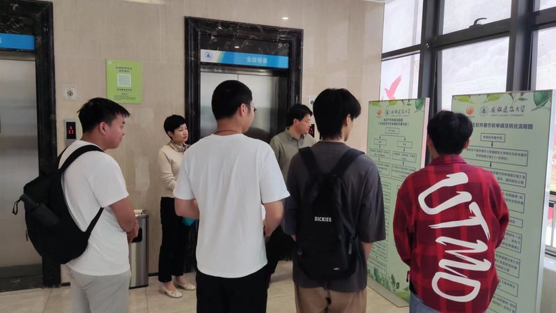 科技成果转化处在实训综合楼一楼大厅布置了“知识产权申请流程”和“在校学生软件著作权申请及转化流程”等展板,准备了宣传册、笔记本,吸引了建规学院、艺术学院等老师学生驻足观看并参与交流。工作人员就师生们提出的发明专利授权周期、软件著作权权利人要求、成果转化方式等问题进行了现场解答,同时向参与活动的师生们介绍并解读了学校知识产权管理及转化相关政策文件。
