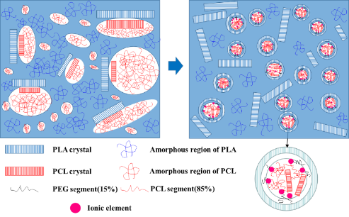 设计合成了系列嵌段离子化共聚物TAPEC(ILs),将PLA/PCL共混物的断裂伸长率提高21倍。并以其为探针,首次以定量的方式证明了双连续相形态和高浓度离子基元可显著增强PCL相的链段运动和离子传导(图1、2)。上述研究为PLA/PCL经典不相容共混体系界面调控提供了新思路,并为通过相界面离子状态示踪共混物相界面形态演化过程提供了理论依据和指导。研究成果发表在Ionics.,2019,25.7: 3189,J.Appl. Polym. Sci.,2020, 138.3:49702,Compo.Commun.,2021.25,100738。相关技术在安徽丰原集团有限公司转化,并成功应用于北京冬奥会生物可降解餐具。