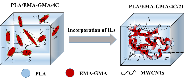 图3.ILs对PLA/EMA-GMA/MWCNTs相结构调控和界面强化增容示意图