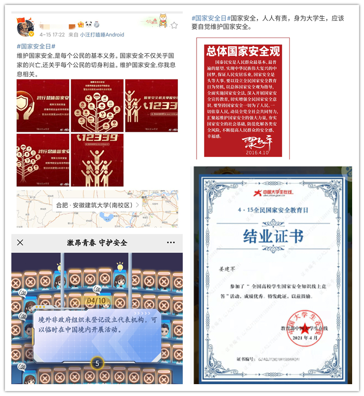 此外,学院还组织学生会开展反邪教警示教育进校园、参与微博话题互动、观摩《一起涨芝士》国家网络安全视频特辑等系列活动。针对国家安全话题,同学们在互动评论区踊跃发表自己的感悟。