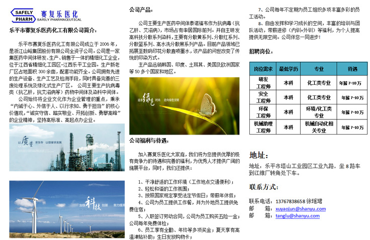 【2022届招聘信息】乐平市赛复乐医药化工有限公司