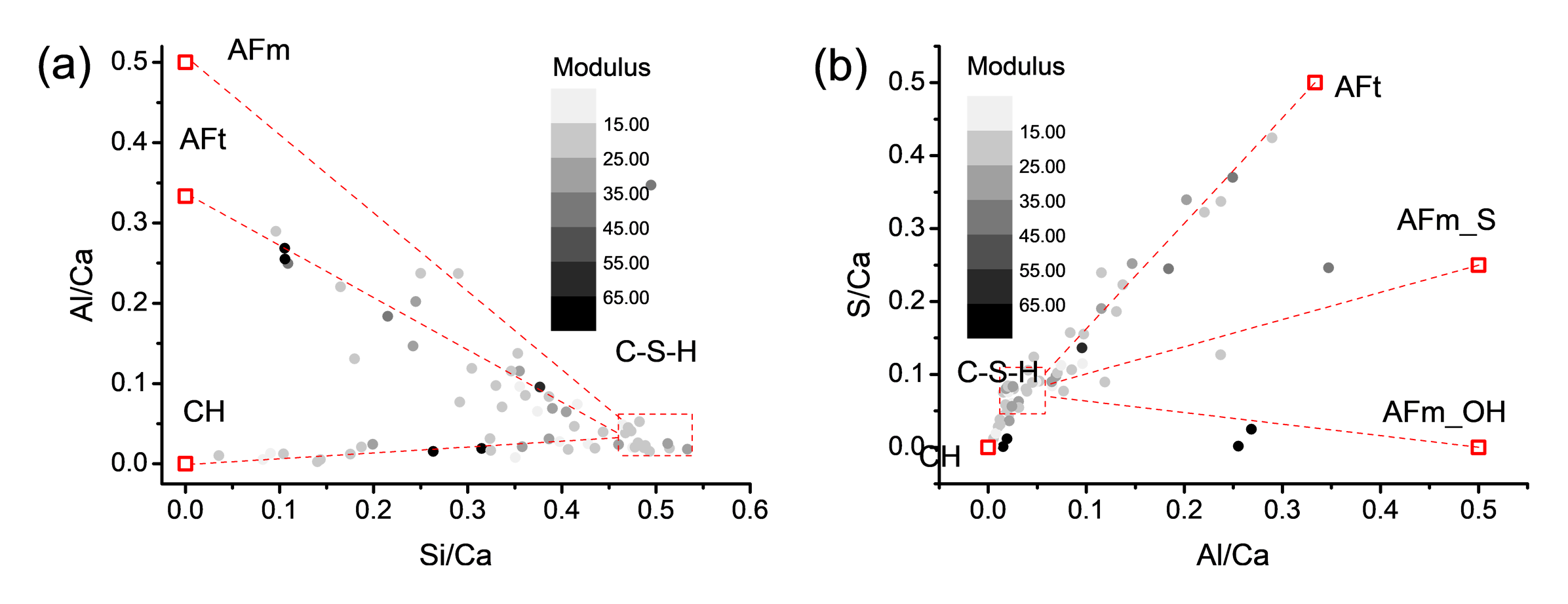 此科研成果采用纳米压痕测试结合SEM-EDS方法,研究了外界硫酸盐侵蚀条件混凝土材料中C-(A-)S-H的力学纳米结构转变规律和性能劣化机理,提出硫酸盐侵蚀引起的C-A-S-H凝胶脱钙脱铝过程中孔隙率增加是其微观力学性能下降的原因,研究成果丰富了对于严酷环境下硫酸盐侵蚀C-(A-)S-H凝胶微结构和性能演变机理的认识。