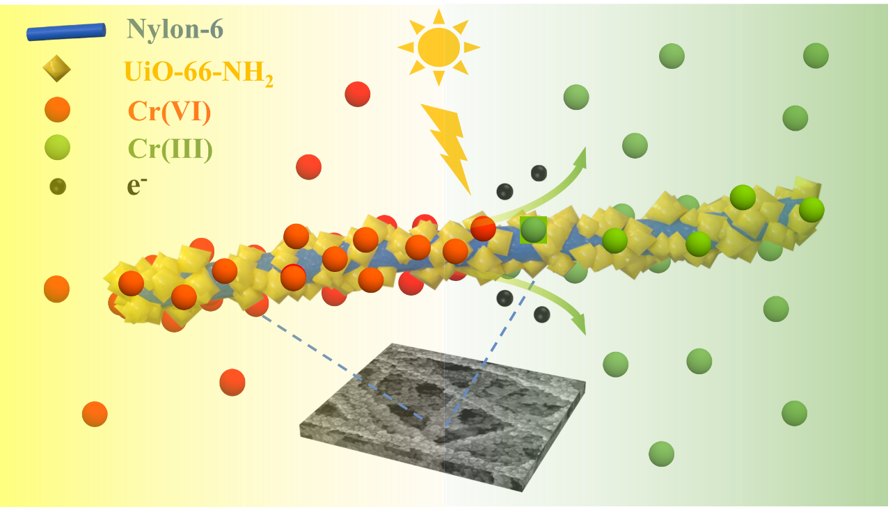 进一步,课题组积极研发高效光催化材料对水体中痕量污染物进行治理和消解。构筑了聚合物/UiO-66-NH2复合纤维膜作为选择性吸附增强可见光催化材料用于重金属Cr(VI)的还原,以“Electrospinning preparation of nylon-6@UiO-66-NH2 fiber membrane for selective adsorption enhanced photocatalysis reduction of Cr(VI) in water”为题发表在Chemical Engineering Journal, 2023, 451: 138973上;构筑了微纳结构铁酸锌空心球用于有机污染物的消解,以“Micro/nanostructured ZnFe2O4 hollow sphere/GO composite for structurally enhanced photocatalysis performance”为题发表在Rare Metals上,研究生季文和赵洋洋分别为论文的第一作者。
