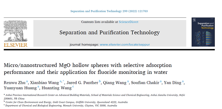 此外,针对皖北地下水体中痕量氟离子的原位监测,发展了微纳米结构MgO通过选择性吸附氟离子配合DGT技术,高效捕获并准确监测水体中痕量氟离子,以“Micro/nanostructured MgO hollow spheres with selective adsorption performance and their application for fluoride monitoring in water”为题发表在Separation and Purification Technology, 2022, 299: 121703上,研究生朱仁武为第一作者。