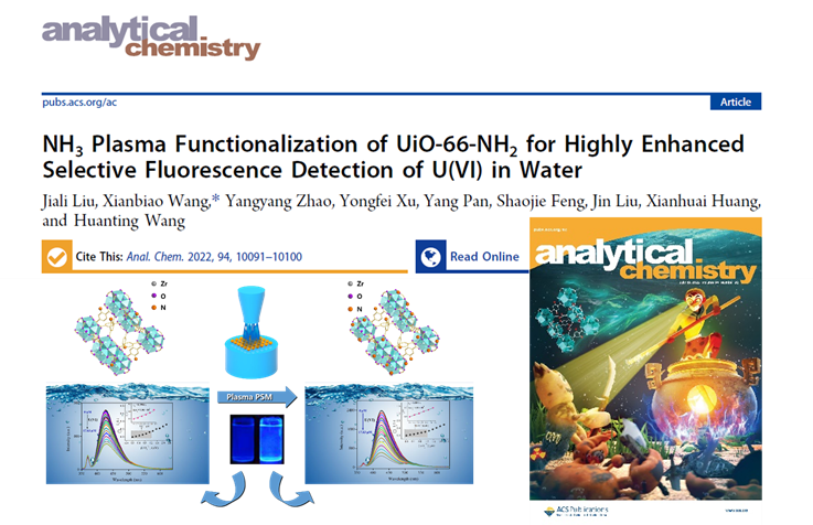 含有放射性铀的核废水由于具有化学毒性和不可生物降解性,对生态环境构成了极大的威胁。放射性核素铀主要以U(VI)离子的形式存在于水体中,不仅严重破坏水和土壤环境,而且对人类神经、循环和泌尿系统有害。因此,迫切需要开发一种在复杂水体中具有高灵敏度和高选择性的U(VI)检测方法。课题组以低成本、环境友好的NH3低温等离子体技术作为荧光探针开关,对UiO-66-NH2进行功能化,使其表面接枝胺基供电子基团,获得LTP@UiO-66-NH2材料,并证实其对水中的U(VI)具有显著的荧光猝灭效应,可作为高灵敏度、高选择性的U(VI)检测荧光探针。相关成果 “NH3 plasma functionalization of UiO-66-NH2 for highly enhanced selective fluorescence detection of U(VI) in water”为题发表在国际权威杂志Analytical Chemistry, 2022, 94: 10091-10100上,并被选为封面论文。研究生刘嘉丽为该论文的第一作者。