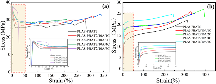 传统石油基高分子材料的大量使用导致的环境问题及 双碳要求逐步提高,促使可生物降解材料的应用范围逐步拓宽。其中聚乳酸聚己二酸-对苯二甲酸丁二醇酯(PLA/PBAT)共混物凭借其独特的降解性能以及优异的机械性能是目前的工业开发的热点。为进一步扩展PLA/PBAT共混物材料在一次性消费电子领域的应用,研究团队持续开展了对PLA/PBAT共混物高性能化的研究。本工作中通过引入一种自主设计的多功能环氧低聚物(MEO,环氧当量值310)作为PLA/PBAT共混物基体的扩链剂,在加工过程中构筑一种界面交联结构,有效增加了两相间的界面粘合力。同时,通过基体比例的调节,诱导了材料微观相形貌的转变,并以此达到通过基体调控碳纳米管(CNTs分散的目的。