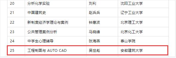 本网讯 近日,教育部在线教育研究中心公示了2023年“拓金计划”项目全年入选课程名单,项目面向国内高校共计遴选34门课程,材化学院吴世彪教授主持的《工程制图与AUTO CAD》线上课程入选。这是材化学院《土木工程材料》获国家级一流课程后,在课程建设上取得了又一新进展。