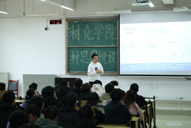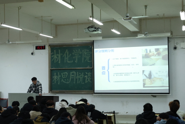 “材思月悦谈”是材化学院倾力打造的大学生思想政治教育品牌活动,计划每月至少举办一次,围绕大家关注的热点话题开展,旨在搭建起有料、有趣、有用的师生之间、朋辈之间的交流互鉴平台,让学生们在思想碰撞中激发新思维,收获精神生命成长所带来的欢悦。今年的政府工作报告提出,要加快发展新质生产力。新质生产力首先跟科技、创新密切相关。因此,本期材思月悦谈邀请国赛获奖学长们与学生们面对面交流,共话“双创”,鼓励同学们紧跟时代前沿,与时俱进,向榜样看齐,向先进学习,以新破旧,勇于实践、敢于创新,争取实现更高突破!作者李碧虹 李祥生 刘瑞芮 赵鑫睿 曹宇欣;审稿:万德军