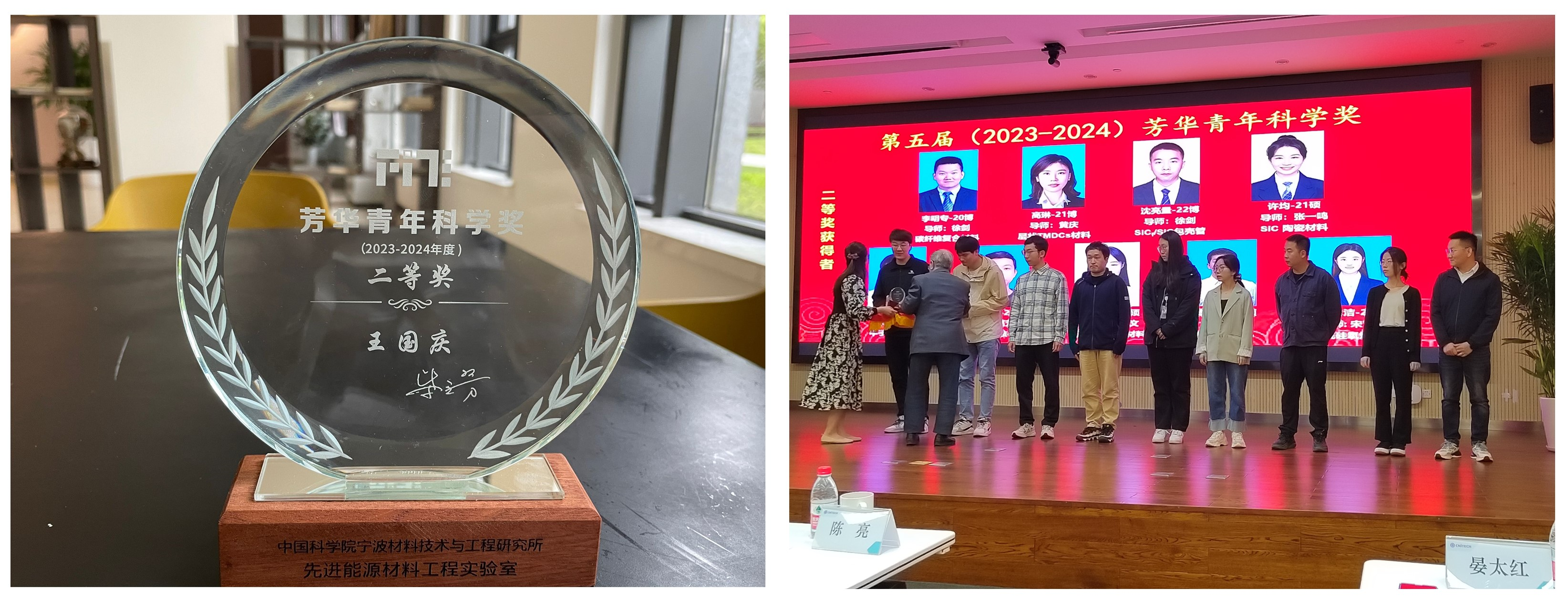 本网讯 近日,我校材料与化学工程学院张峰君教授和中国科学院宁波材料技术与工程研究所周小兵研究员联合培养的2021级硕士研究生王国庆,在参加中科院宁波材料所先进核能材料实验室暨全省数据驱动高安全能源材料及应用重点实验室的揭牌仪式上获得了“芳华青年科学奖”二等奖(一等奖空缺)。