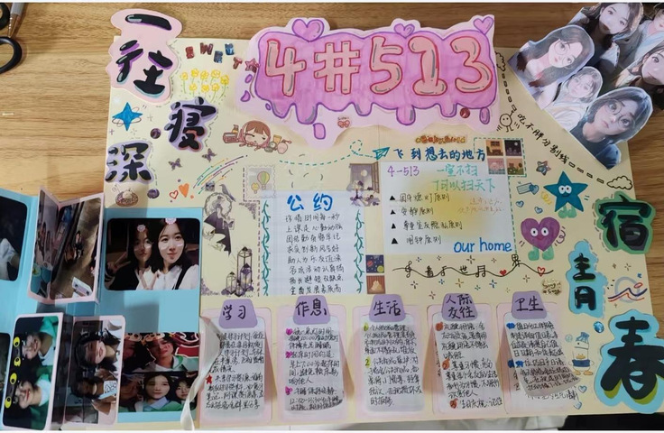 宿舍公约由宿舍全体成员共同商讨并制定,内容覆盖学习、生活、卫生、作息及人际交往等多个维度,并鼓励宿舍成员发挥创意,为公约增添独特的文化内涵,彰显宿舍的个性和精神风貌。学院全体学生积极响应、踊跃参与,认真设计出许多富有独特创意的作品,有的是精心手绘,有的是制作海报,有的是PPT呈现……形式丰富、构思精妙,宿舍成员的共同期望与目标被创意十足地展现在公约之中。经过两轮评议,最终,4#513、4#509、17#416三个宿舍的作品荣获一等奖。