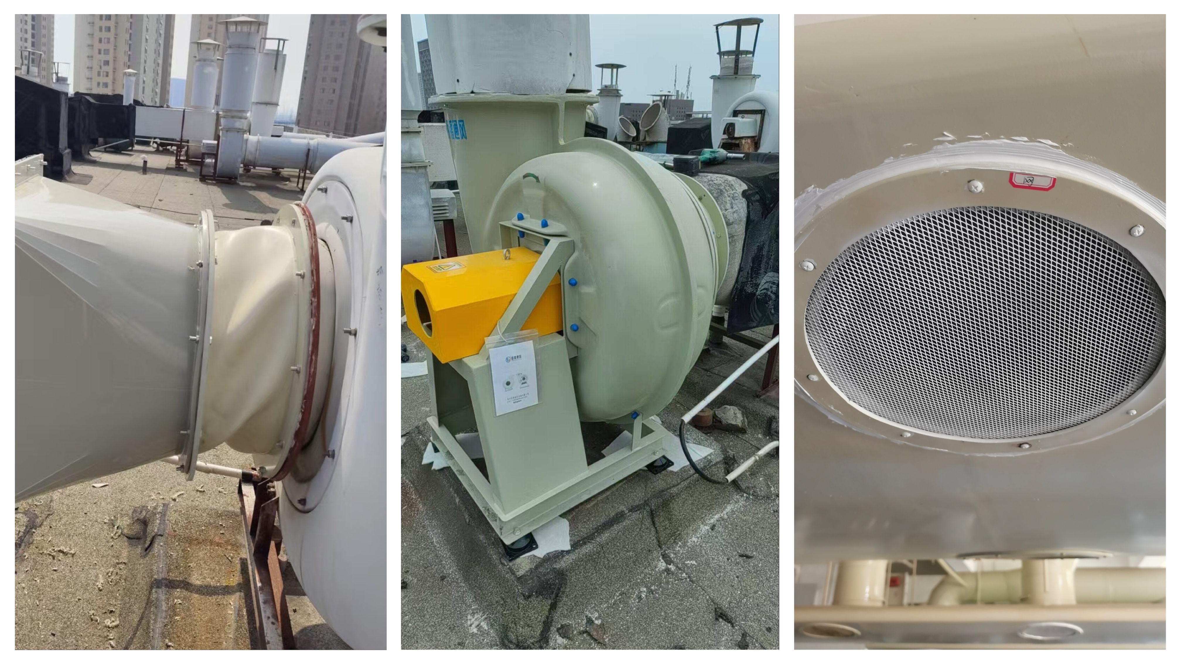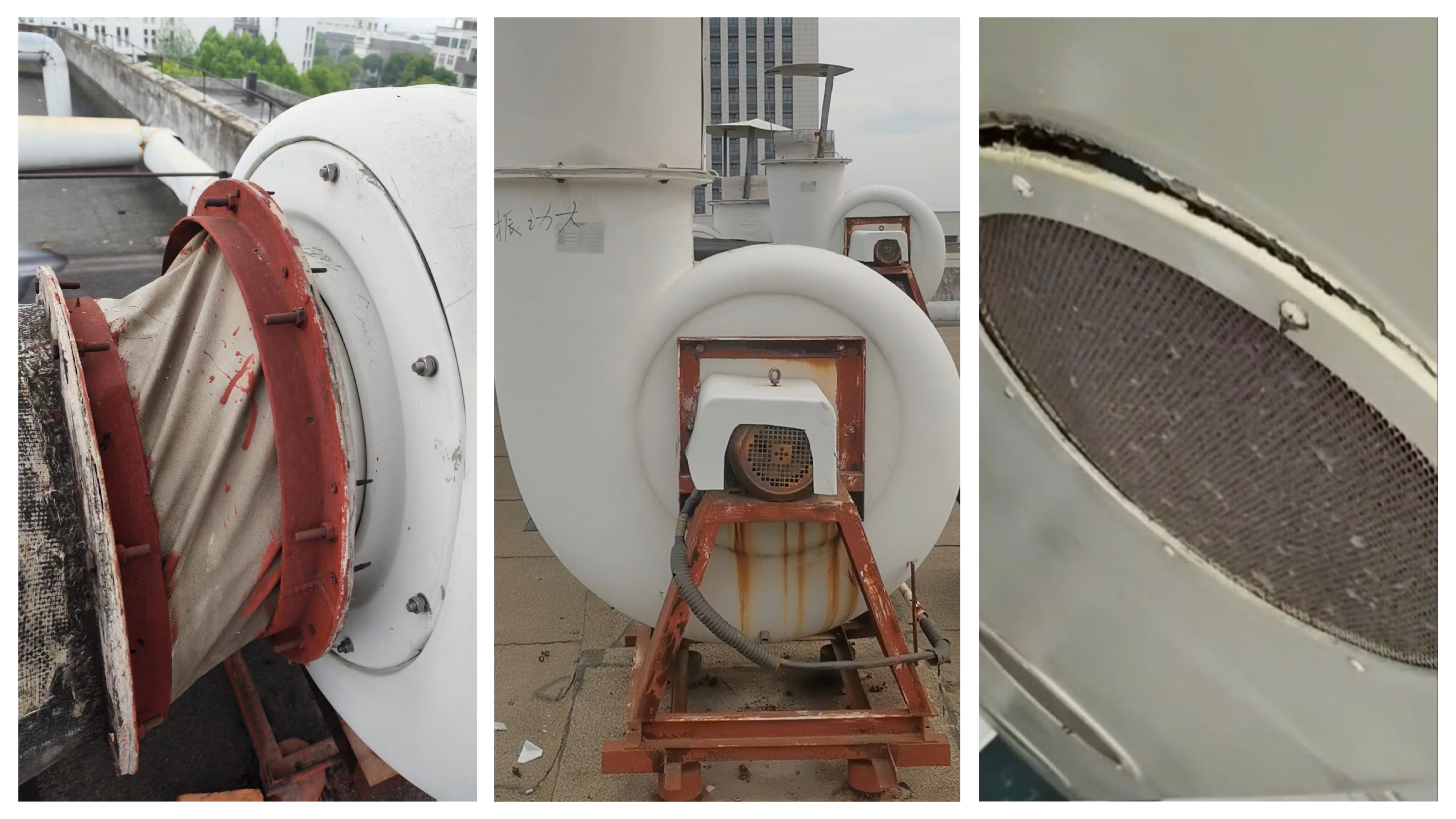 针对排查出的问题,学院迅速组织专题讨论,敲定维修方案,明确三大任务:更换楼顶破损的软连接;更换故障风机并对所有风机进行全面保养;彻底清洗8间实验室的通风罩口。