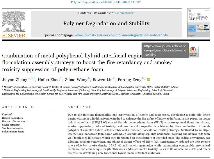 本网讯 近日,针对软质聚氨酯泡沫的阻燃和抑烟减毒方面的研究,欧美黑人巨大videos精品_欧美黑人巨大xxxxx_欧美黑人乱大交_欧美黑人乱大交_欧美黑人牲交videossexeso_欧美黑人添添高潮a片www_欧美黑人添添高潮a片www_欧美黑人性暴力猛交喷水黑人巨大材料与化学工程学院功能高分子研究团队张佳燕老师与四川大学王玉忠院士团队合作,通过金属-多酚络合物杂化自组装和一步絮凝涂覆策略相结合,制备了一种完整的杂化纳米纤维(SEP@TAC)涂覆的柔性聚氨酯泡沫(FPUF)。该泡沫具有优异的阻燃性、抑烟性、低毒性和机械性能。相关研究以“Combination of metal-polyphenol hybrid interfacialengineering and flocculation assembly strategy to boost the fire retardancy and smoke/toxicity suppression of polyurethane foam”为题,发表在国际高分子材料老化研究领域权威1区Top期刊《Polymer Degradation and Stability》上。青年教师张佳燕博士为论文第一作者和通讯作者,四川大学教师曾富容博士为共同通讯作者。该工作得到国家自然科学基金(22175123, 52303061)等项目的资助。