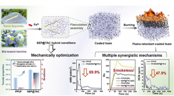 面对这一困境,本研究通过金属-多酚络合物杂化自组装和一步絮凝涂覆策略相结合,制备了一种完整的杂化纳米纤维(SEP@TAC)涂覆的柔性聚氨酯泡沫(FPUF),该泡沫具有优异的阻燃性、抑烟性、低毒性和机械性能。在多重相互作用的驱动下,纳米级单宁-铁沿着海泡石纳米纤维有序组装,形成狼牙棒状的杂化棒,并以预定的质量絮凝在基材上。SEP@TAC 的自由基清除、气体稀释、催化转化和物理阻隔效应协同降低了热释放速率(-69.9%)、烟密度(-93.9%)和毒性产生,同时保持了相当的机械弹性并提高了强度。这项工作解决了易燃材料中的烟雾毒性问题,并为开发新型功能性混合阻燃材料提供了新思路。