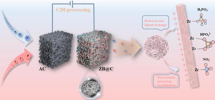本研究开发了一种基于锆基金属有机框架的复合电极材料 Zr-BTB@CNTs,并结合电容去离子(CDI)技术实现了硝酸盐与磷酸盐的高效共去除。通过将 Zr(IV) 金属中心与 1,3,5-(4-羧基苯基)苯(H3BTB)配体锚定于碳纳米管(CNTs),成功构建了具有丰富缺陷结构的三维导电纳米网络。实验结果表明,Zr-BTB@CNTs电极在 1.2 V 工作电压下对 500 mg L-1  NO3-  PO43- 表现出显著的协同吸附性能,其吸附容量分别达到 222.1 mg g-1  159.9 mg g-1。该电极在宽 pH 范围(3-11)内表现出稳定的电化学活性,并在连续 10 次吸附-再生循环后仍保持高于 80% 的污染物去除率。此外,该电极具有实际应用潜力,在处理实际富营养化水体(巢湖、南淝河)和工业含氮磷废水后均符合世界卫生组织(WHO)排放标准。该研究为CDI技术实现了硝酸盐与磷酸盐的高效共去除提供了新思路。