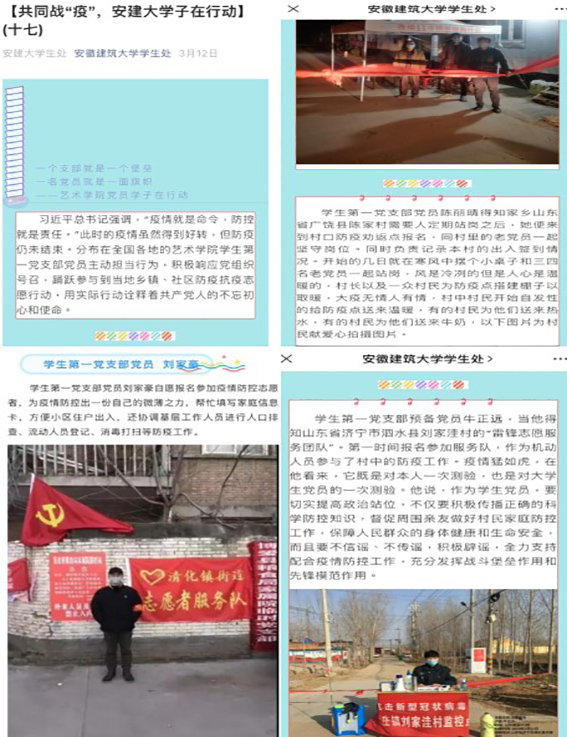 党支部充分发挥新媒体宣教功能。疫情初期,积极引导艺术学子发挥专业特长,助力抗击疫情。在“传承徽文化弘扬价值观”公众号上展示,后续被学习强国、安徽商报等多家主流媒体转载推介。
