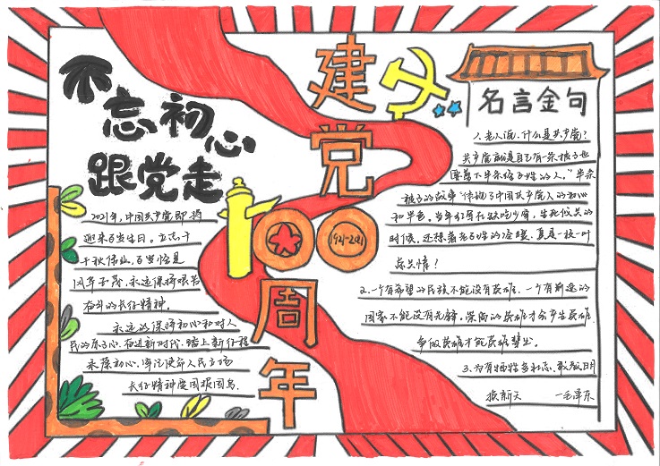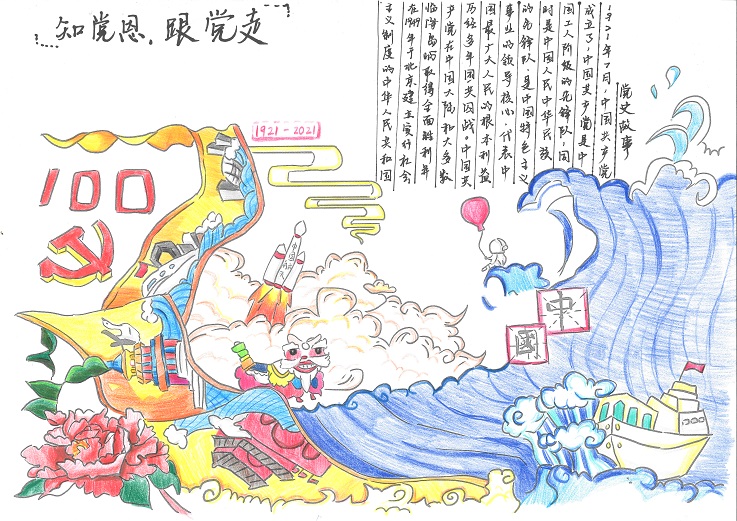 峥嵘岁月,如歌情怀。手绘图内容丰富,图文并茂,包含了从1921年到2021年中国共产党历经艰难曲折的奋斗,中国共产党让世界看到了东方巨龙的崛起。此次活动意在引导学生认识中国共产党在开辟中国特色社会主义道路中展现出的巨大勇气、智慧和力量,表达出内心对党的热爱和敬仰,强化了学生们的爱国意识、厚植家国情怀。(文/图:蒋瑾 杨光洁 危远荣 审稿:孙长城)