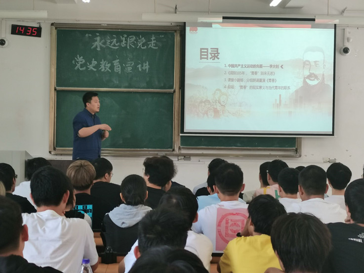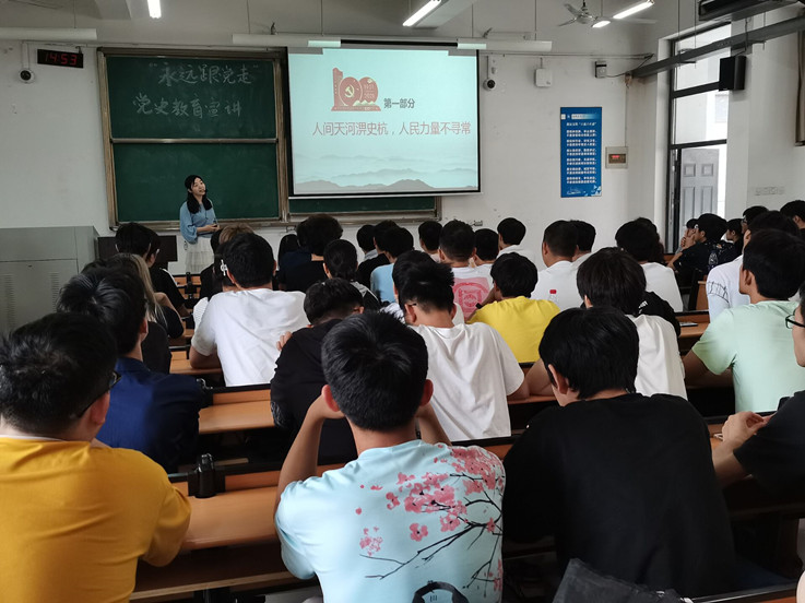 本网讯  为弘扬革命精神,传承红色基因,树立广大青年学党史、感党恩、听党话、跟党走的坚定信念,落实学校《关于组织开展2021年“永远跟党走”主题班会方案征集活动的通知》精神,6月4日,机电学院在逸夫楼5220举办“永远跟党走”党史教育宣讲暨辅导员主题班会观摩活动。机电学院辅导员杨慧老师和于曈老师担任本次观摩会主讲,全体辅导员和160名学生参加了此次活动。