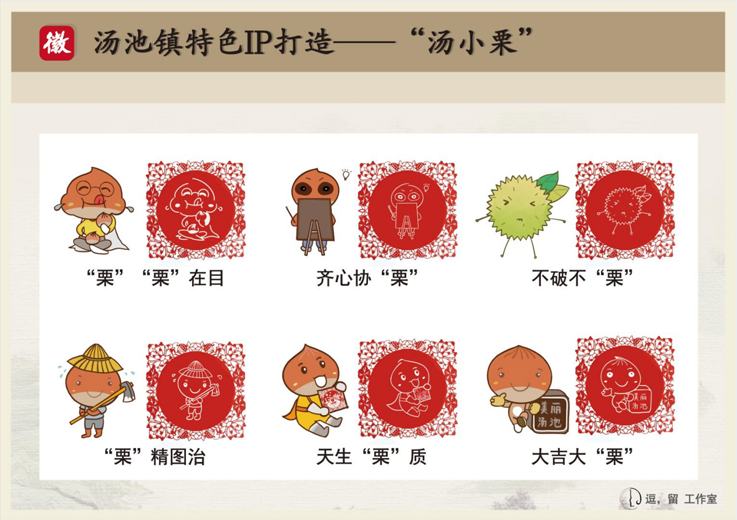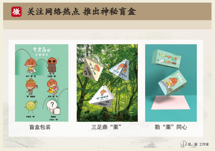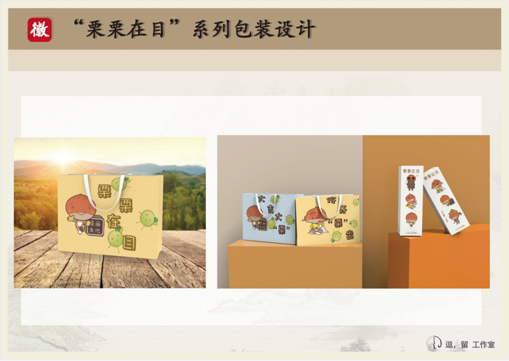 建规学院城乡规划专业学生党支部联合逗留工作室,以文化富能特色产品,徽韵助力地方产业,提炼汤池地方特色产业,打造原生IP形象“汤小栗”,推出天生“栗”质、“栗”精图治、大吉大“栗”等系列形象,并结合IP形象推出“栗栗在目”系列包装,融合环保理念,推出棉麻系列包装,引入盲盒概念,推出神秘盲盒系列产品。