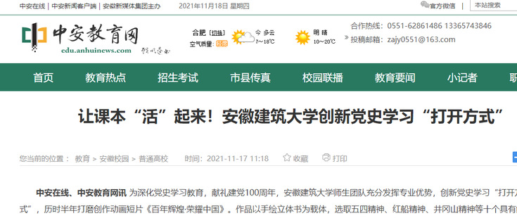 作品一经推出,广受关注好评。为了进一步提高党史学习效果,该校与中建国际投资有限公司联合举办“百年辉煌•筑梦前行”庆祝中国共产党成立100周年党史展览。在原动画形式的基础上进行实体化延伸,在展区内开辟党史精神、安徽记忆、合肥城市建设成果三个主题板块,除运用文字、图片、多媒体等常见的现代布展手段以外,更结合“立体书”的立体展陈形式,让观众身临其境,缓缓走入书中,开启沉浸式党史学习体验。展馆开放期间,吸引多家单位组团参观学习,也让不少参观者连连惊叹党史学习的新潮“打开方式”。