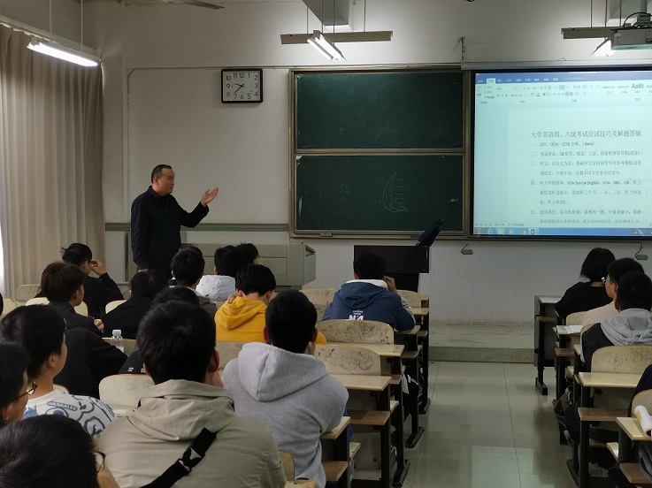 11月17日下午,外国语学院大学英语第二教研室教师党支部在教学主楼1309教室开展“大学英语四、六级考试考前辅导”讲座。讲座由支部姚吉刚老师主讲。