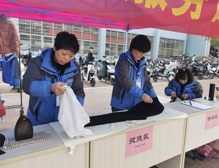 本次爱心服务日依然设置了衣物缝补、熨烫、自行车修补等热门项目,还未到活动开始时间,就有同学们三三两两带着需要缝补的衣物来找阿姨,阿姨们分工得当,有的缝补,有的熨烫,不一会一件件衣服就补好了。维修师傅们一丝不苟地修理着同学们的自行车,补胎、打气、上链条,动作行云流水。