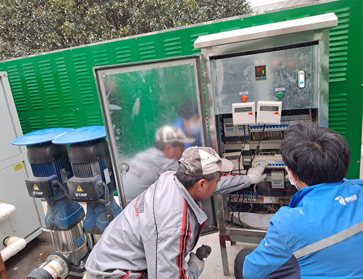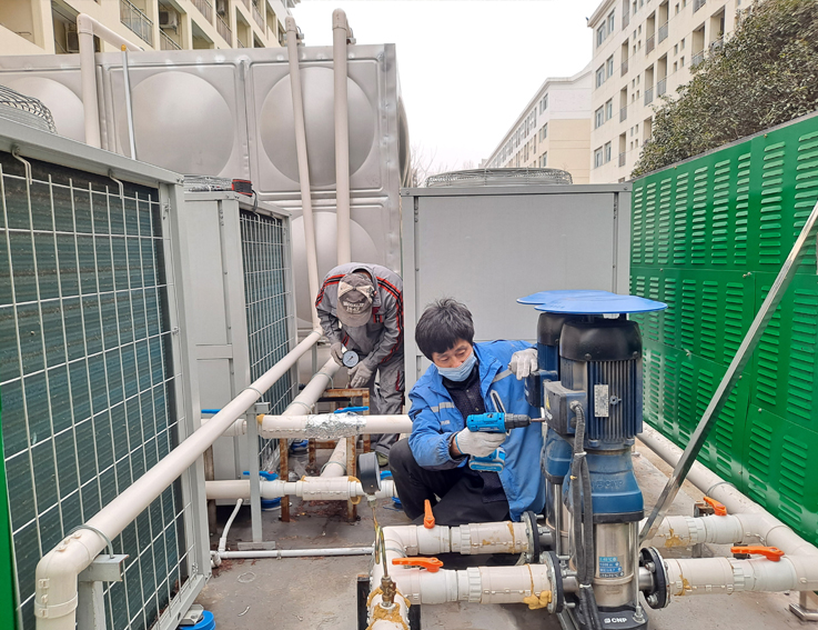 系统维护了学生公寓能源站空气源热泵系统的热泵机组、电控柜、水箱、加压水泵、控制阀、水管管网、水电表、电器线路、用水终端等设备,对水箱进行清洗、消毒、注水。调试维护工作持续一周,共调试维护17个能源站水箱、56台空气能、45台循环泵、28台增压泵,77间浴室。