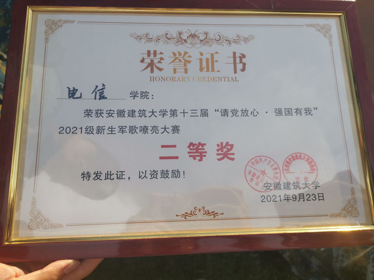 军训过程中,同学们不怕苦不怕累,一滴汗水一个脚印,一招一式力求完美。他们的队伍整齐划一,步伐铿锵有力,精神斗志昂扬,口号响彻天空。他们挺拔的身姿带动起阵阵微风,明净的脸上洋溢着青春自信,风姿潇洒,气宇轩昂。军歌嘹亮,唱响校园,“请党放心,强国有我”2021级军歌嘹亮大赛取得了“二等奖”的佳绩。