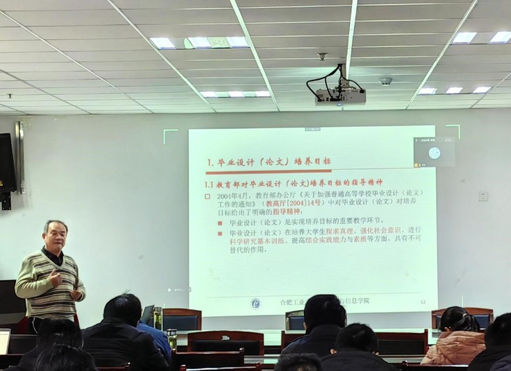 本网讯  为加强本科毕业设计(论文)的规范化管理,提高学生毕业设计(论文)质量,推动本科教育教学审核评估和专业认证工作顺利进行,127日,电信学院邀请教育部计算机类专业指导委员会委员、安徽省高校计算机教育研究会理事长、教育部工程教育认证专家、合肥工业大学博士生导师胡学钢教授以“毕业设计(论文)教学设计与建设”为题做了专题报告。