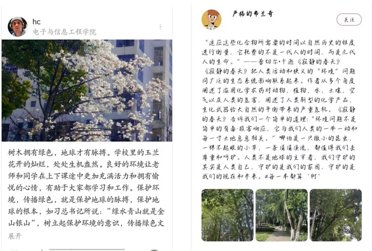 本次活动形式新颖,参与同学通过分享展示自身环保感悟与环保事迹,并在学院新媒体平台上添加“自定义话题#每一本都算‘树’”进行发帖,交流对于环保的看法与理解。