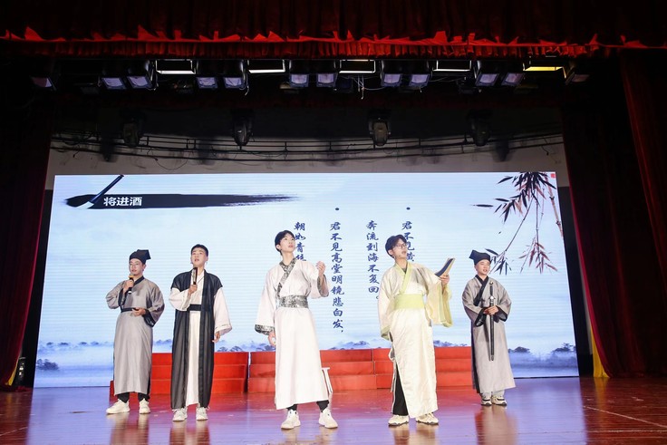 比赛中,铿锵有力的节奏掀起一波又一波高潮,嘹亮的嗓音,舞动的旋律,传神的表演令现场观众激情澎湃。每一个节目的精彩展现都是同学们刻苦练习数月的结果,比赛的顺利进行也离不开每一位工作人员的努力和学校及学院的大力支持。最后,由院学生会带来的情景话剧节目《将进酒》,为大赛画下圆满的句号。古典文化与现代艺术形成鲜明对比的同时充分诠释了中华优秀传统文化的艺术魅力。
