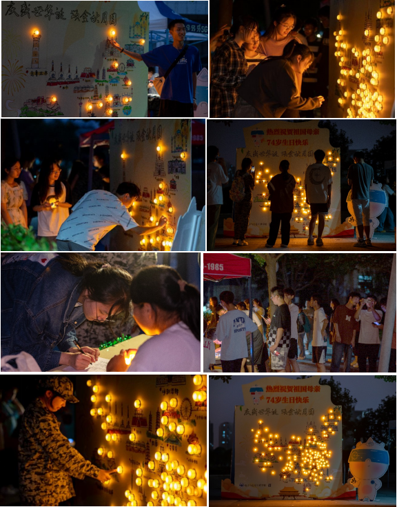 天色渐晚,华灯初上,点灯活动签到处排起了长龙,现场气氛热烈,同学们耐心引导排队签到,领取星星灯,亲手点亮在描绘着伟大祖国大好河山的彩绘展板上,寄托对祖国的美好祝愿,也蕴含着青年当有志,立志在四方,祖国需要处,皆是我故乡美好寓意。