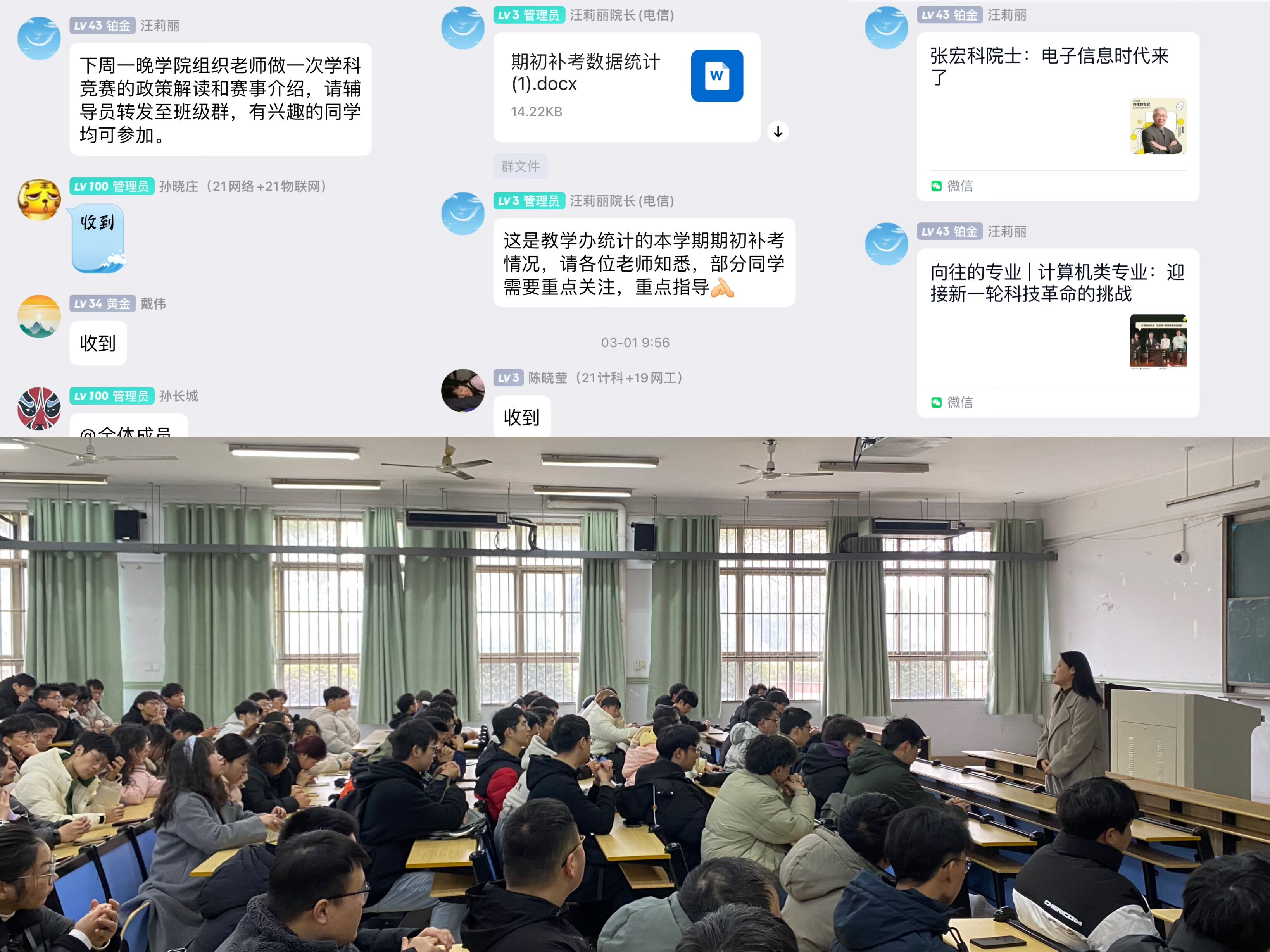 本网讯 为深入学习贯彻党的二十大精神,巩固主题教育成果,电信学院着力践行“四下基层”优良传统和工作方法,坚持深入学生群体现场研究、现场协调,把学生急难愁盼问题解决在一线,把学生教育教学管理工作落实在一线,不断提升学生在校学习、生活的体验感和满意度。