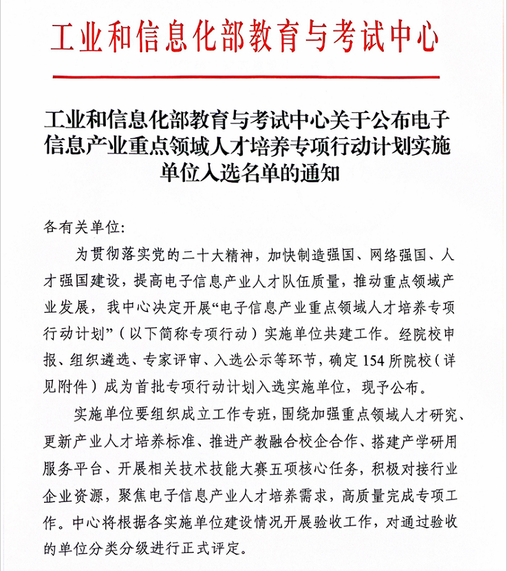 我校入选“电子信息产业重点领域人才培养专项行动计划”实施单位