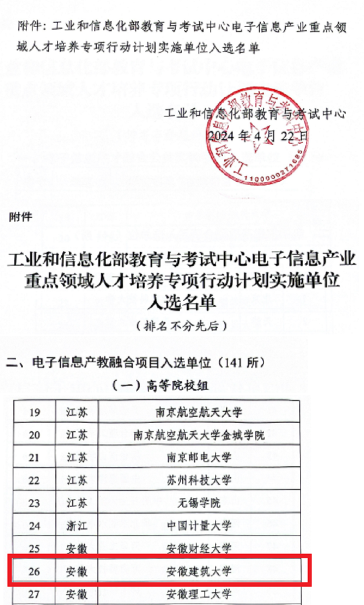 本网讯 近日,工业和信息化部教育与考试中心公布了电子信息产业重点领域人才培养专项行动计划实施单位入选名单,我校电子与信息工程学院申报的电子信息产教融合项目成功获批,成为全国154所院校首批专项行动计划入选实施单位之一。